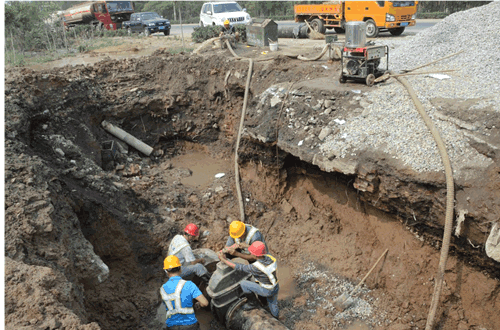 據現場(chǎng)工作人員介紹,爆管處位于107國道東側廢棄的排水溝附近,地下不斷涌出的自來(lái)水造成搶修地點(diǎn)附近多次發(fā)生塌陷,給搶修工作帶來(lái)了不利。為盡快修復受損管線(xiàn),確保搶修期間人員及過(guò)往人員車(chē)輛的安全,自來(lái)水公司搶修人員擴大了現場(chǎng)圍擋的面積,開(kāi)挖出近20平米的長(cháng)方形型作業(yè)面,并將長(cháng)5米的受損水泥管道整體更換為鋼管。 搶修工地負責人楊華告訴記者,該處輸水管線(xiàn)直徑400毫米,是連接市區到黃粱夢(mèng)鎮的唯一輸水管線(xiàn)。這條管線(xiàn)的爆裂直接影響該鎮居民的用水,“我們安排搶修工人分班作業(yè),不間斷連夜搶修,確保輸水管線(xiàn)盡快修復!