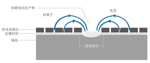 ● 損傷的自愈作用 噴鋅層的一個(gè)主要特點(diǎn)是能夠在損傷處自動(dòng)修補保護層,以保護保護層的完整。鋅離子通過(guò)密封毛孔(即瀝青漆涂料)遷移到損傷處填補傷口并轉變成穩定的不可溶解的鋅化物。