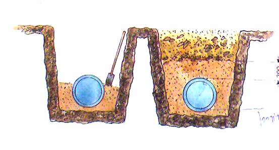 在多是石塊的土層情況下,為保護管子有條理地連續置放,應考慮安裝層的問(wèn)題(松軟土質(zhì)不必考慮)。安裝層由松軟的顆粒狀物質(zhì)組成(沙土、小碎細石粒、過(guò)篩土),其厚度應保證底部距石塊層最小距離≮100㎜。見(jiàn)圖1